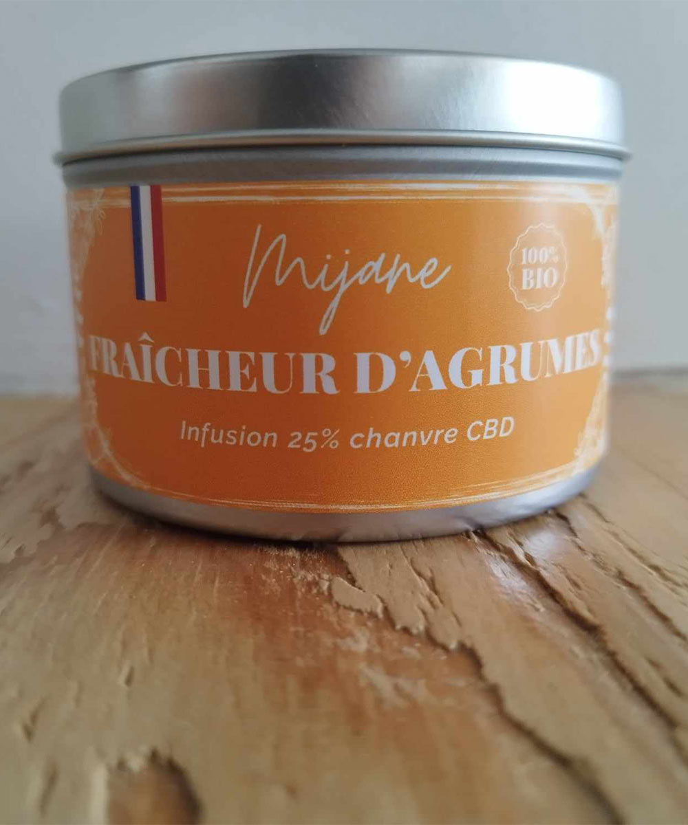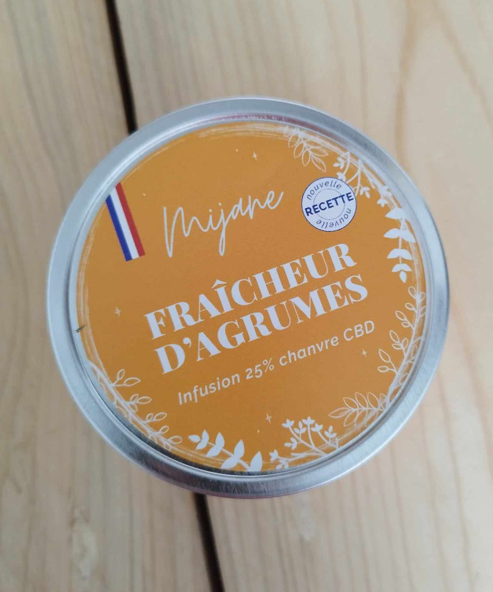 Ingrédients : Chanvre CBD (25%), citronnelle, mélisse, thym citron, citron, menthe poivré, citron vert, orange.