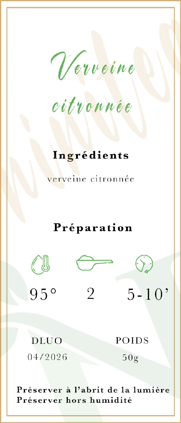 La verveine, une infusion qui incarne la fraîcheur et la vitalité de la nature. La verveine, des feuilles délicatement cueillies pour vous offrir une expérience gustative pure et revigorante. La verveine est appréciée pour son parfum citronné et ses bienfaits pour la détente. Laissez-vous transporter par les arômes apaisants de cette infusion naturelle. Rejoignez-nous pour une aventure sensorielle où chaque gorgée de verveine vous offre une bouffée de fraîcheur et de sérénité.
